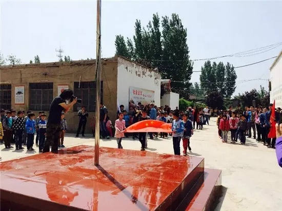 少先隊員向參加捐贈儀式的愛心代表人士敬獻(xiàn)紅領(lǐng)巾,并獻(xiàn)上孩子們花費一下午時間親自采摘的鮮花,并舉行升國旗儀式。