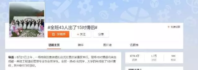 這條消息,最早出現(xiàn)在5月21日的微博和各大網(wǎng)站上,“全班一共43人,大學(xué)四年成就了15對(duì)情侶,畢業(yè)之際在重慶某景區(qū)舉辦集體婚禮?!本W(wǎng)友直呼:這簡(jiǎn)直不可思議。