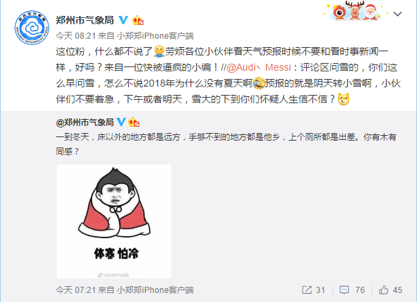 眾多網(wǎng)民發(fā)現(xiàn)不能玩雪,于是組隊去玩“鄭州市氣象局”了。在“鄭州市氣象局”的新浪微博上,網(wǎng)友有的調(diào)侃,有的逼問,把氣象局的小編已經(jīng)“逼瘋”。目前,該小編已經(jīng)開始在微博上暴走,每小時更新一次微博,并且和每位回復(fù)的粉絲“較真”的討論起這讓人瘋狂的“暴雪”為什么還不來。