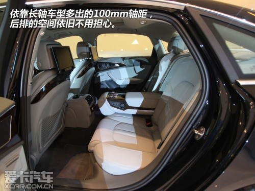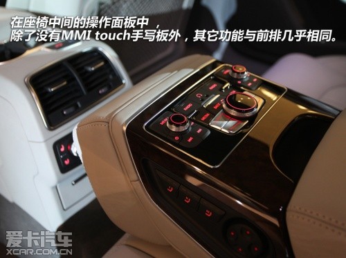 轉(zhuǎn)至后排,這里應(yīng)該同樣是車主們最為關(guān)注的,依靠長(zhǎng)軸車型多出的100mm軸距,后排的空間依舊不用擔(dān)心。而影音娛樂(lè)系統(tǒng)也同樣沒(méi)有被忽視,在座椅中間的操作面板中 ,除了沒(méi)有MMI touch手寫(xiě)板外,其它功能與前排幾乎相同。