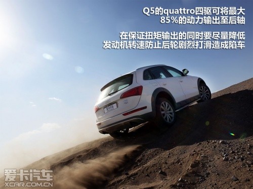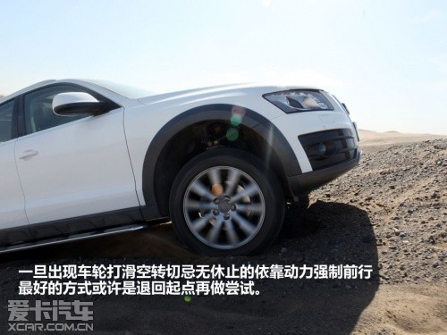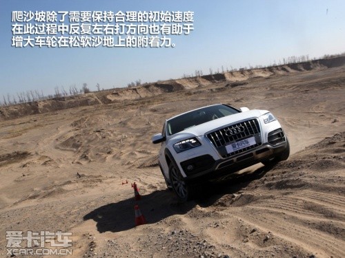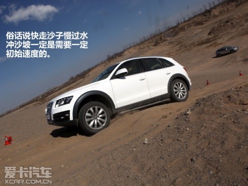 沙坡前半部分的坡度相對要緩一些,而奧迪Q5通過這里的過程自然也是毫不費力。那么在接下來更陡的后半部分當(dāng)中,坡度的增大導(dǎo)致了車速急劇下降,此時松軟的沙子也就成為了車輛繼續(xù)攀爬的絆腳石,恰恰也就在此刻,檢驗quattro四驅(qū)系統(tǒng)真正能耐的時候隨之而來。