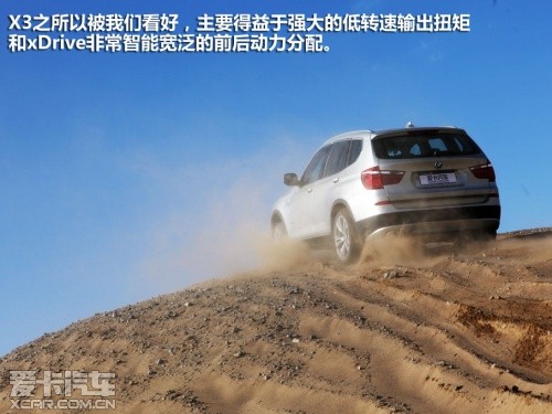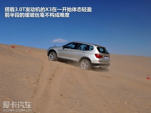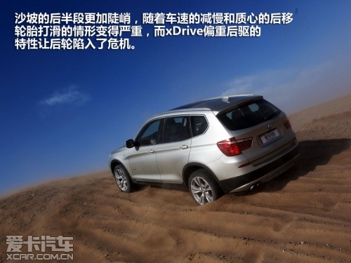 或許是奧迪Q5完成測試的過程比較順利,我們對接下來即將登場的寶馬X3也普遍比較看好,這或許就是思維慣性帶來的固定套路吧。然而在實地測試過程中,這臺X3攀爬沙丘的過程卻沒有表現(xiàn)出它在公路上所煥發(fā)出的霸氣。400?!っ椎淖畲笈ぞ卦诔鞘械缆分校踔猎诟咚俟飞隙际菬o與倫比的,但移步至眼前狂風(fēng)大作的沙丘,這400?!っ椎呐ぞ貏t像是心有余而力不足的悲情英雄。