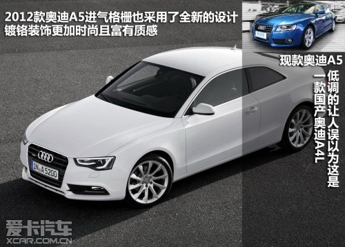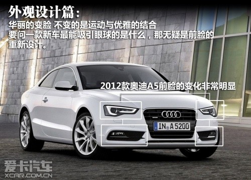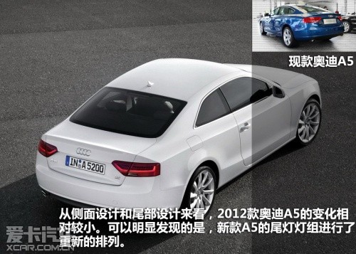 2012款奧迪A5屬于中期改款車型,在外觀、內飾、動力和底盤上都有較為明顯的變化。除了A5和其高性能版S5的稱謂,新車主要細分為雙門Coupe版、Sportback版以及Cabriolet敞篷版。