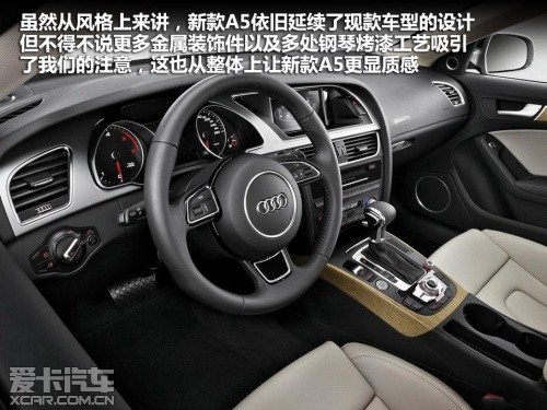2012款奧迪A5采用了全新設計的多功能方向盤,與現(xiàn)款車型相比在造型上有了小幅的修改,除了方向盤更加厚實以外,原本方形的金屬環(huán)繞裝飾被圓型所替代。