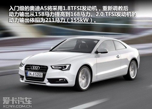 入門級的奧迪A5將采用1.8TFSI發(fā)動機,重新調教后,動力輸出從158馬力提高到168馬力。2.0 TFSI發(fā)動機的動力輸出依舊為211馬力(155kW)。