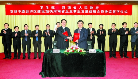 3月21日,衛(wèi)生部、河南省政府支持中原經(jīng)濟區(qū)建設(shè)加快河南省衛(wèi)生事業(yè)發(fā)展戰(zhàn)略合作協(xié)議簽字儀式在北京舉行。衛(wèi)生部部長陳竺(前右一),省長郭庚茂出席儀式并代表雙方在協(xié)議書上簽字。
