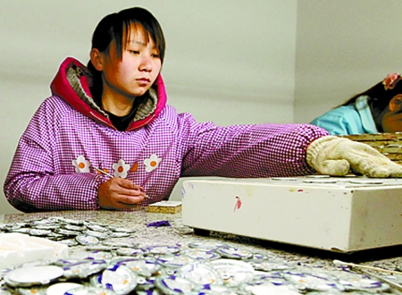 信陽市平橋區(qū)明港鎮(zhèn)大營村利用城郊地理優(yōu)勢(shì),通過招商引資吸引外來投資3億多元。圖為3月27日,村民正在村里的合盛五金飾品加工廠制作徽章。 河南日?qǐng)?bào)記者 鄧 放 攝