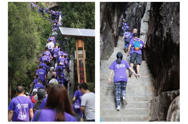 行至盧崖瀑布,泉水自山崖逐級(jí)跌落,聚水成潭,仿似人間仙境,令人流連忘返;稍事休整后,1000位登山者通過吊橋、一線天,沿途崖壁陡削,奇石林立。不少人已經(jīng)開始吃力,身強(qiáng)力壯的男士拉著女友的手一步一臺(tái)階地共同攀爬,稚嫩的孩童和爸爸媽媽一起,大手拉小手一邊說笑、暢享山水風(fēng)光,一邊努力克服陡峭險(xiǎn)阻的山路。到了峰頂,無論是浪漫的情侶還是幸福家庭,在群山之巔“一覽眾山小”,感悟真誠和熱情、信任與支持,體會(huì)共擔(dān)風(fēng)雨的愛之真諦。