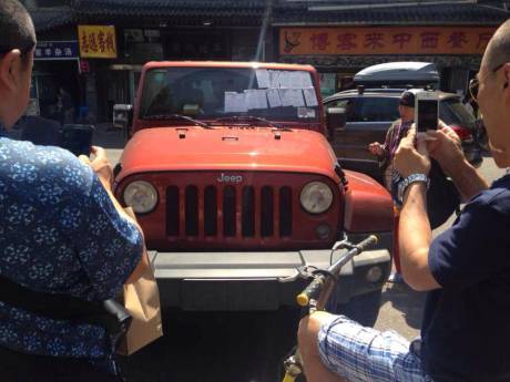 一輛紅色越野車(chē)上被10余張罰單覆蓋,引來(lái)不少市民圍觀。擋風(fēng)玻璃、后視鏡、前門(mén)的車(chē)窗上都被交警的罰單糊住了。