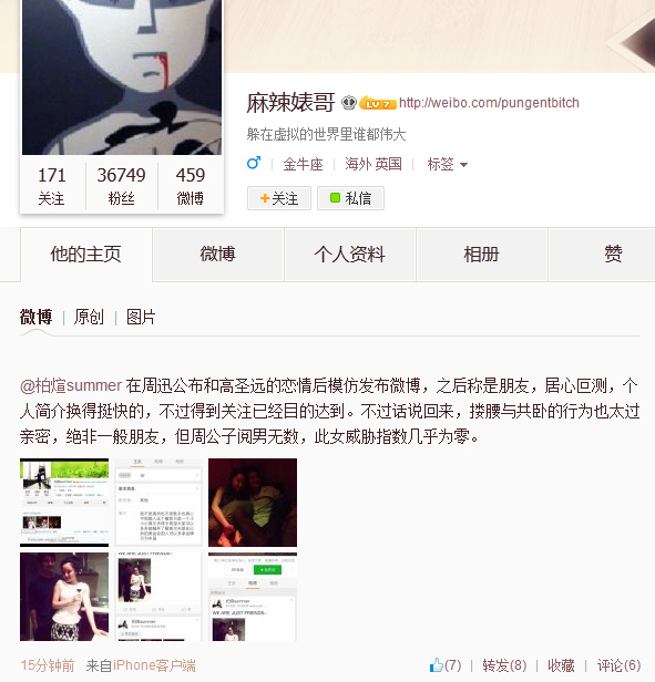 該微博也引起了不少熱心網(wǎng)友的注意,微博@麻辣婊哥懷疑@柏煊summer在刻意炒作,微博稱:“@柏煊summer 在周迅公布和高圣遠(yuǎn)的戀情后模仿發(fā)布微博,之后稱是朋友,居心叵測(cè),個(gè)人簡(jiǎn)介換得挺快的,不過(guò)得到關(guān)注已經(jīng)目的達(dá)到。不過(guò)話說(shuō)回來(lái),摟腰與共臥的行為也太過(guò)親密,絕非一般朋友,但周公子閱男無(wú)數(shù),此女威脅指數(shù)幾乎為零。 ”