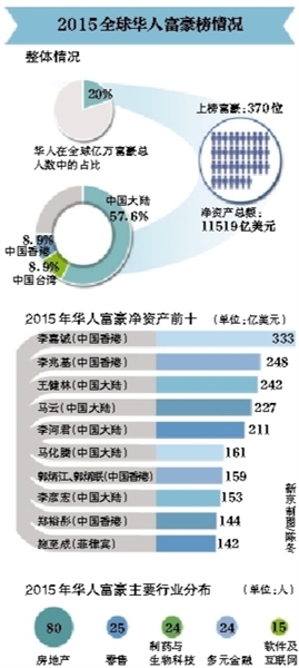 從行業(yè)分布看,華人富豪前十中,房地產(chǎn)巨頭依然占據(jù)最多席位。此外,2015年上榜的370位華人富豪中,房地產(chǎn)依舊牢牢占據(jù)著第一的位置,有80位、超過20%的華人富豪涉足房地產(chǎn)行業(yè)。其中,大連萬達集團董事長王健林以凈資產(chǎn)242億美元躋身前三,也是大陸富豪第一位。(記者 梁薇薇)