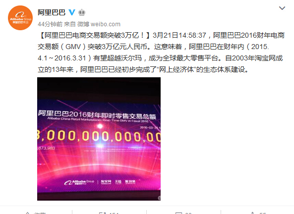 阿里巴巴3月21日宣布,截至3月21日14:58:37,阿里巴巴2016財(cái)年電商交易額(GMV)突破3萬億元人民幣。這意味著,阿里巴巴在財(cái)年內(nèi)(2015.4.1-2016.3.31)有望超越沃爾瑪,成為全球最大零售平臺。