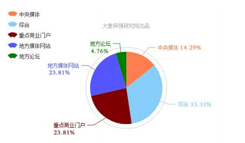 上圖可以看出,關(guān)注此事件的網(wǎng)絡(luò)媒體中,綜合類(lèi)網(wǎng)站傳播活躍度最高,重點(diǎn)商業(yè)門(mén)戶網(wǎng)站和地方媒體網(wǎng)站旗鼓相當(dāng)、緊隨其后。