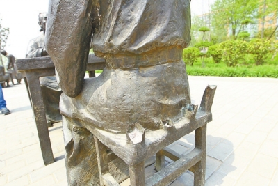 其中,第一組雕塑體現(xiàn)的是一個(gè)小男孩和一個(gè)小女孩在一塊石板上玩耍的場(chǎng)景,但十分刺目的是,小男孩右胳膊從腕關(guān)節(jié)上方處被鋸掉,右手不知去向,同時(shí)小女孩的兩個(gè)羊角辮也被鋸了一半;第二組是一個(gè)老年人和一個(gè)年輕人在切磋技藝的場(chǎng)景,但所用桌子的兩個(gè)桌牚均被鋸掉;第三組中,圍繞方桌飲酒賦詩的幾位老者所坐椅子靠背均被掰掉。