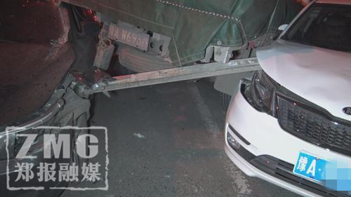 鄭報(bào)融媒記者看到,肇事寶馬車為懸掛豫A號(hào)牌的灰色5系轎車,該車車頭左側(cè)撞擊卡車后保險(xiǎn)杠后受損嚴(yán)重,受傷部位由車身延伸至駕駛艙,鐵質(zhì)車身被劃開一道約20厘米寬的口子,駕駛位上方車頂部位則卡在了卡車車尾之下。