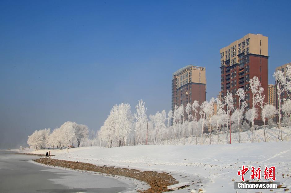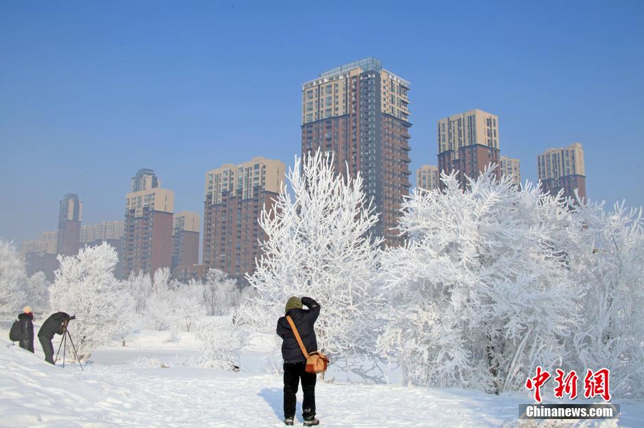 2014年1月21日,游客在吉林省吉林市松花江畔附近拍攝霧凇美景。吉林市2014年首場(chǎng)大雪后,松花江畔銀裝素裹,出現(xiàn)霧凇美景。中新社發(fā) 朱萬(wàn)昌 攝 圖片來(lái)源:CNSPHOTO