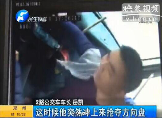 監(jiān)控顯示,鄭州2路公交車正常行駛中,突然一男子沖上來猛拉方向盤,并與公交車長廝打在一起。男子將車長狠狠地壓在方向盤上,無法動彈。而其動手的原因竟是因為坐過了站,車長沒有及時給他開門。事后,民警對此事進行了調(diào)解。