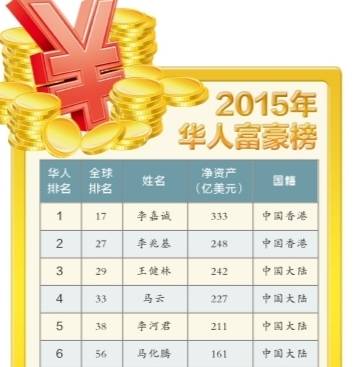 昨日《福布斯》雜志中文版發(fā)布2015華人富豪榜。李嘉誠(chéng)以?xún)糍Y產(chǎn)規(guī)模333億美元再次蟬聯(lián)第一;李兆基第二;王健林第三,凈資產(chǎn)達(dá)242億美元,雄霸?xún)?nèi)地首富。河南共有4位企業(yè)家上榜,天瑞集團(tuán)董事長(zhǎng)李留法以?xún)糍Y產(chǎn)規(guī)模21億美元領(lǐng)跑。