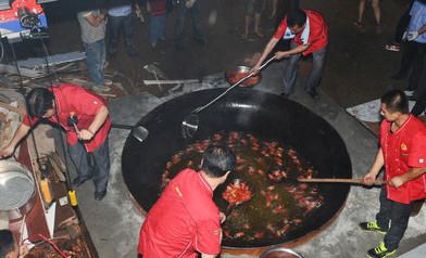 19日,在長沙后湖啤酒音樂節(jié)上,4位廚師用一口直徑達(dá)3.2米的大鐵鍋,用木柴作燃料,歷時(shí)3小時(shí),成功烹飪出味道香辣鮮美的1000斤口味蝦,并免費(fèi)贈送市民品嘗。