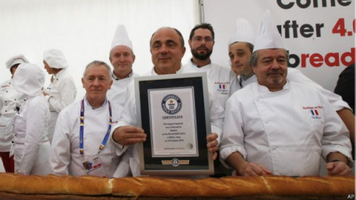 據(jù)悉,這個(gè)法式長(zhǎng)棍面包是由60名面包師,辛苦工作將近7個(gè)小時(shí)完成的。