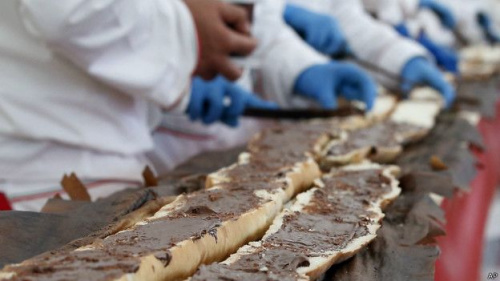 之后,面包師將長(zhǎng)棍兒切成過(guò)百段,涂上榛子巧克力醬,送給在場(chǎng)見(jiàn)證的觀眾分享。