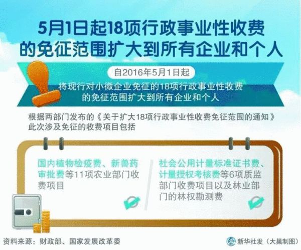 4月28日,財(cái)政部網(wǎng)站發(fā)布《關(guān)于擴(kuò)大18項(xiàng)行政事業(yè)性收費(fèi)免征范圍的通知》:自5月1日起,擴(kuò)大18項(xiàng)行政事業(yè)性收費(fèi)免征范圍。