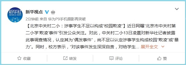 【北京中關(guān)村二?。荷媸聦W(xué)生不足以構(gòu)成“校園欺凌”】近日網(wǎng)曝“北京市中關(guān)村第二小學(xué)‘欺凌’事件”引發(fā)公眾關(guān)注。對(duì)此,中關(guān)村二小13日凌晨對(duì)新華社記者披露此事調(diào)查情況,認(rèn)定其為“偶發(fā)事件”,尚不足以認(rèn)定涉事學(xué)生構(gòu)成校園“欺凌”或“暴力”。同時(shí),校方表示,“對(duì)該事件發(fā)生深深自責(zé),對(duì)給學(xué)生及家長(zhǎng)帶來(lái)的傷害,深表歉意”,將汲取教訓(xùn),以此為鑒,本著認(rèn)真理性、客觀公正的原則,妥善處理。(新華社記者魏夢(mèng)佳、梁天韻)