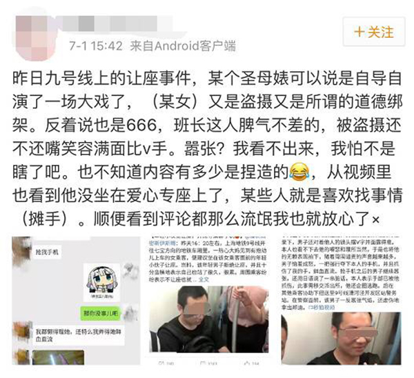7月1日,該男子發(fā)微博稱,他原本收拾耳機(jī)準(zhǔn)備讓座的,這時大媽就開始說他這不是那不是,說得他很氣憤,就賭氣不讓了。