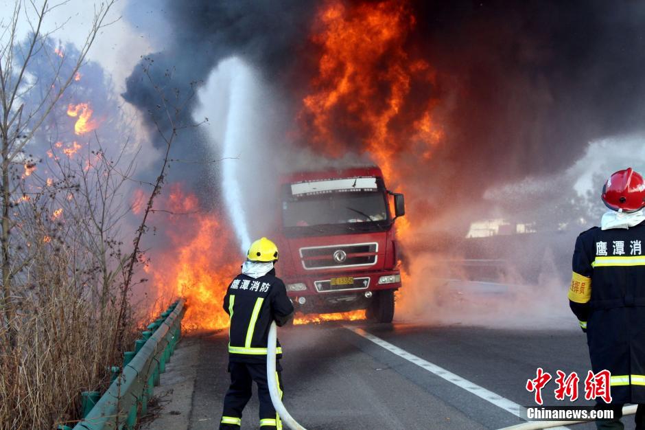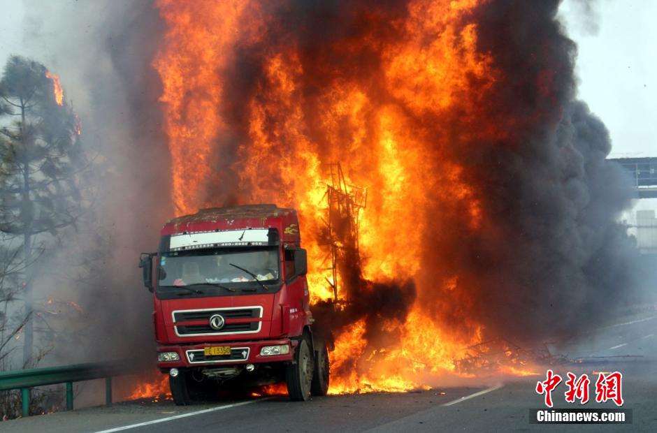 1月23日下午16時(shí)許,滬昆高速公路江西弋陽往貴溪方向593公樁(貴溪收費(fèi)站附近)一輛載有133部電動(dòng)車的半掛車起火,導(dǎo)致電動(dòng)車被大火“吞噬”。江西貴溪消防官兵接警后迅速到場撲救,半小時(shí)后將大火撲滅。據(jù)司機(jī)稱,火災(zāi)疑因高速護(hù)坡雜草叢起火產(chǎn)生的火芯飄至半掛車,引燃包裝電動(dòng)車的紙殼箱所致。中新社發(fā) 龔武 攝
