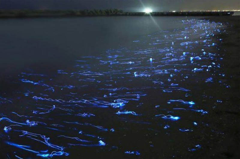 熒光烏賊是海洋中神奇的發(fā)光生物,通常只有7厘米長,具有復(fù)雜的表皮發(fā)光器和眼球發(fā)光器。在日本富山灣海下三四百米深的海溝中棲息著大量熒光烏賊,他們的一生大部分時(shí)間生活在海底,每年的3月至6月浮到海面產(chǎn)卵。每年這一時(shí)節(jié)的夜晚,聚集在富山灣沿岸的熒光烏賊協(xié)調(diào)一致地發(fā)出藍(lán)光,將整個(gè)海岸點(diǎn)亮,如夢(mèng)如幻,成為富山灣獨(dú)特的風(fēng)景,吸引著眾多游客前來欣賞。