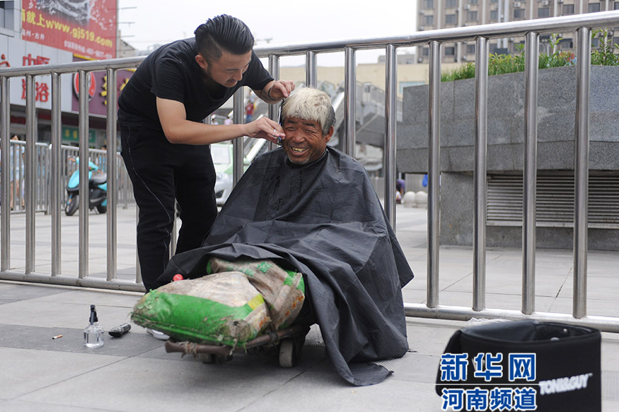 從7月21日開始,一位名叫紅濤的理發(fā)師每逢周二在鄭州街頭免費為流浪人員理發(fā),他希望用此項行動呼吁大家關(guān)注街頭流浪人員群體。紅濤說,他還打算免費為農(nóng)民工等群體理發(fā),讓他們感受到社會的溫暖。新華社發(fā)(馮大鵬 攝)