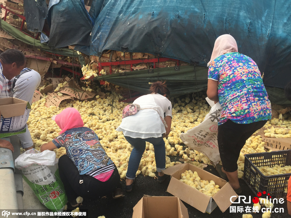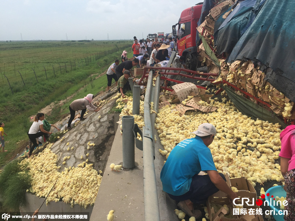 8月25日中午,山東榮烏高速濱州沾化區(qū)段,一輛山東禽類運輸車輛傾翻,車上裝有數(shù)萬只小雞。無數(shù)小雞散落在路上和高速護坡上,死的死傷的傷,大多數(shù)存活。
