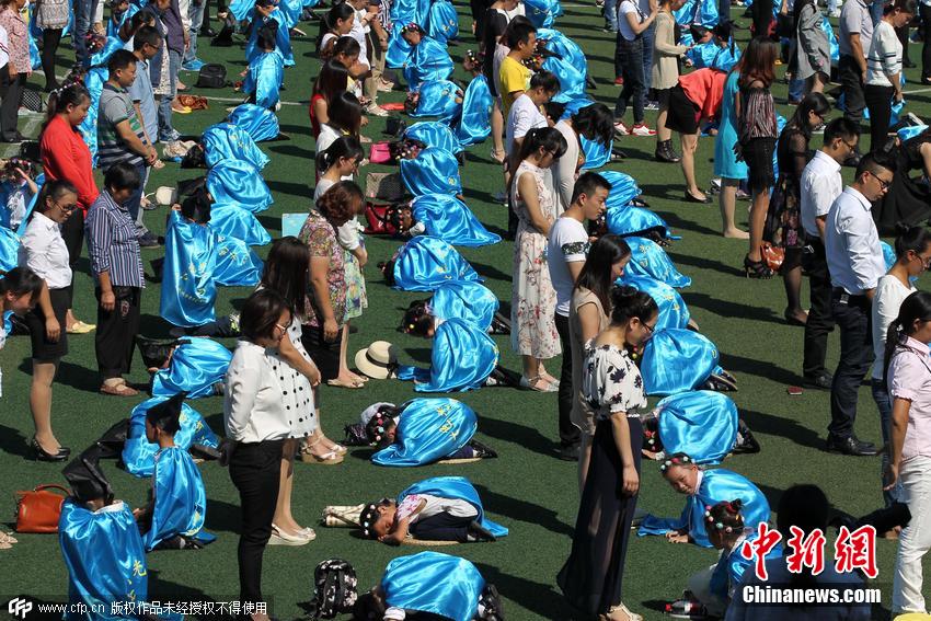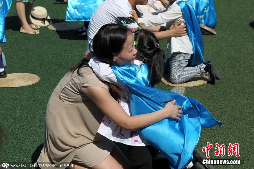 2015年9月10日,江蘇南通,北城小學(xué)舉行“點(diǎn)亮成長中的每個日子”大型入學(xué)儀式,532名新生和家長一起參加“感恩禮”、“拜師禮”和“開筆禮”等獨(dú)具特色的新生入學(xué)禮,讓學(xué)生體驗(yàn)傳統(tǒng)禮儀,將好學(xué)、尊師孝親等中華傳統(tǒng)美德融入到學(xué)習(xí)和生活中。圖為一年級學(xué)生跪在蒲墊上行感恩禮,與父母擁抱。 圖片來源:CFP視覺中國