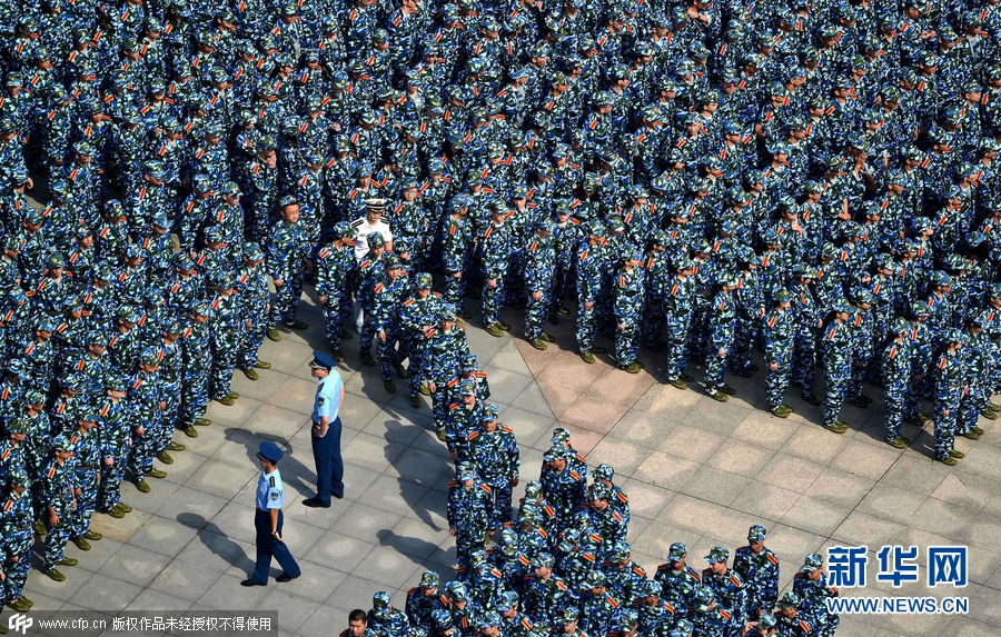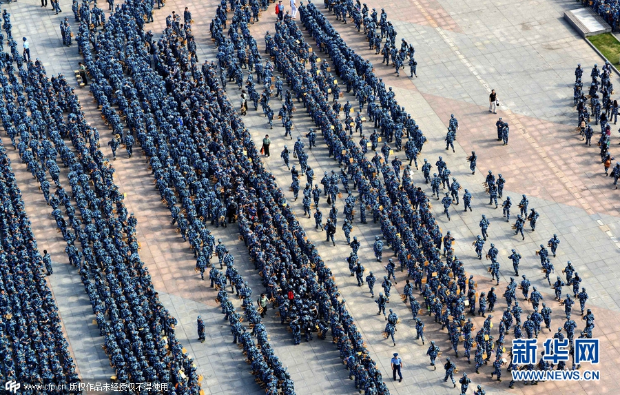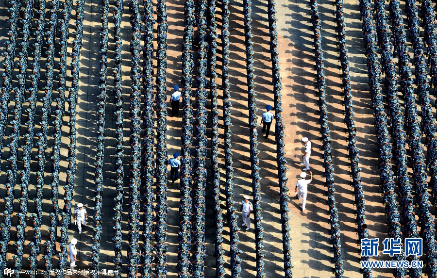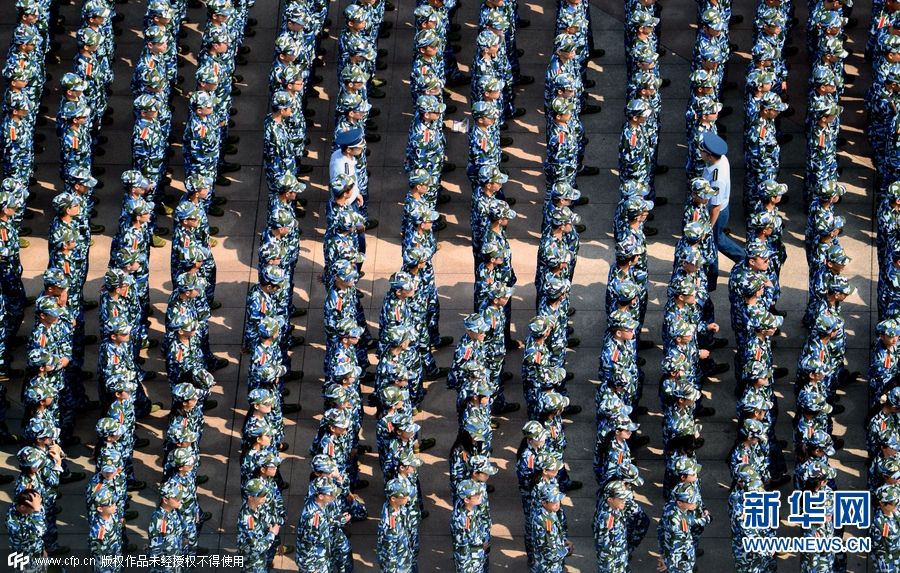 2015年9月14日,湖北武漢,當(dāng)日上午,武漢理工大學(xué)2015級本科生開學(xué)典禮暨軍訓(xùn)動員大會在該校南湖校區(qū)舉行,全校多個校區(qū)約9000名新生身著迷彩戎裝一起進行軍訓(xùn),場面震撼壯觀。南湖校區(qū)現(xiàn)場集合了約7000名新生參與軍訓(xùn),隊列整齊、英姿颯爽,熱情投入軍訓(xùn),開啟了朝氣蓬勃的大學(xué)新生活。圖片來源:cfp