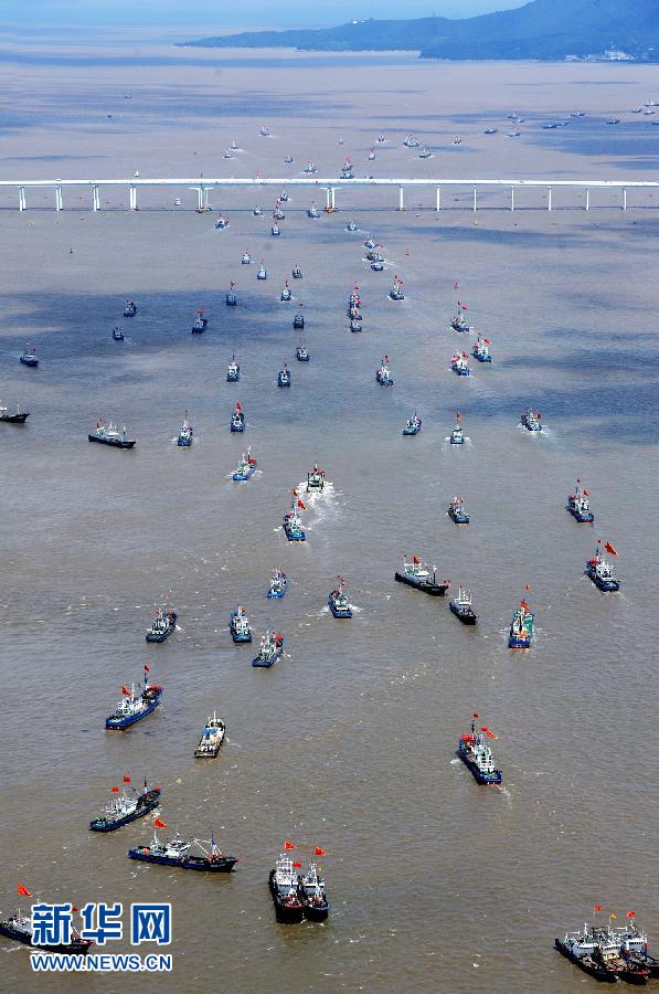 9月16日,浙江省舟山市沈家門漁港的漁船出港經(jīng)過朱家尖大橋開赴漁場。當(dāng)日,為期3個半月的東海伏季休漁結(jié)束,眾多漁船劈波斬浪,開往漁場。 新華社發(fā)(華志波 攝)