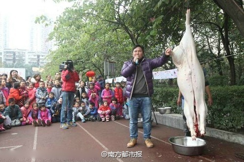 12月24日下午,重慶玉帶山小學(xué)舉行“民俗文化代代傳 傳統(tǒng)文化進(jìn)校園”活動(dòng)。學(xué)校從鄉(xiāng)下買回兩頭年豬,請(qǐng)來村民講述年豬習(xí)俗,殺豬匠殺豬后,科學(xué)老師為學(xué)生講解年豬身體結(jié)構(gòu)。