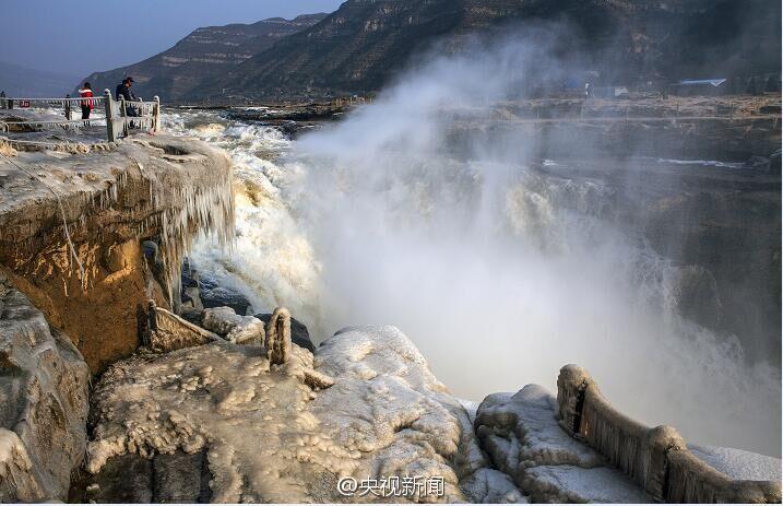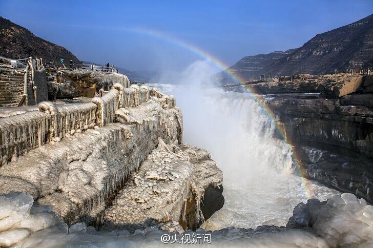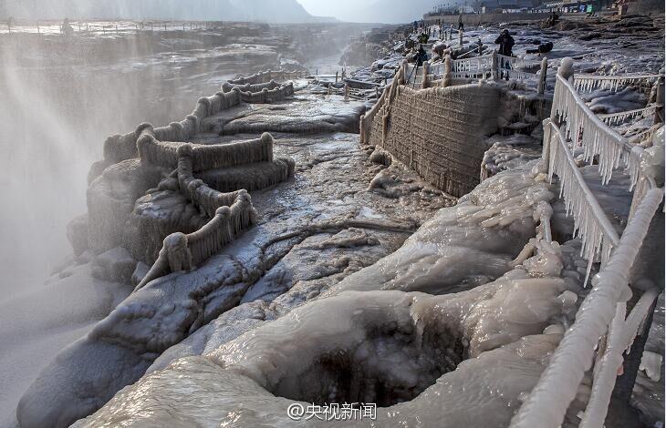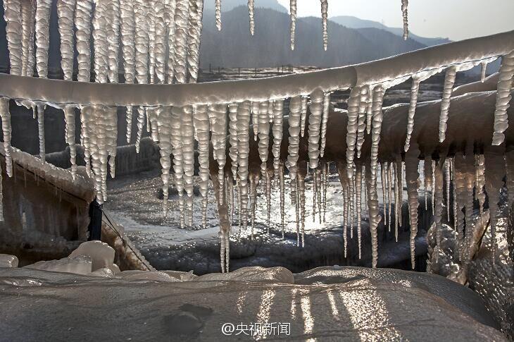 據(jù)中央電視臺新聞中心官方微博12月26日報道,近日受持續(xù)降溫影響,黃河壺口瀑布出現(xiàn)冰掛美景。這些冰掛都是黃河水從瀑布傾瀉而下,冒起的水霧迅速凍結(jié)而成。依懸瀑布兩岸的冰掛晶瑩剔透、造型各異,有的像龍須,垂懸在巖石上;有的如無暇白玉,鑲嵌在河岸旁。(央視記者王志杰 圖片來源:中央電視臺新聞中心官方微博)