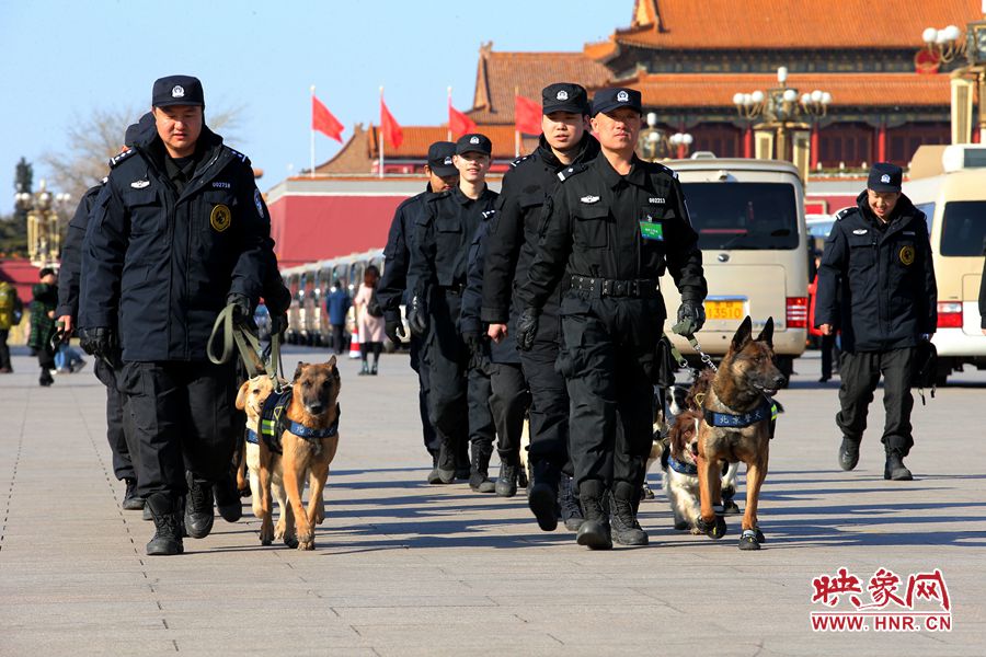 訓練有素的警犬巡邏在廣場上 段晉哲/圖