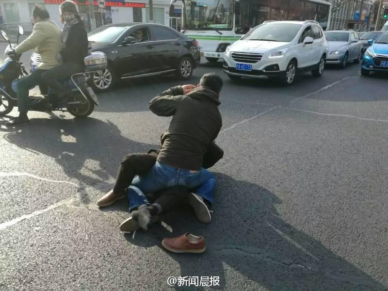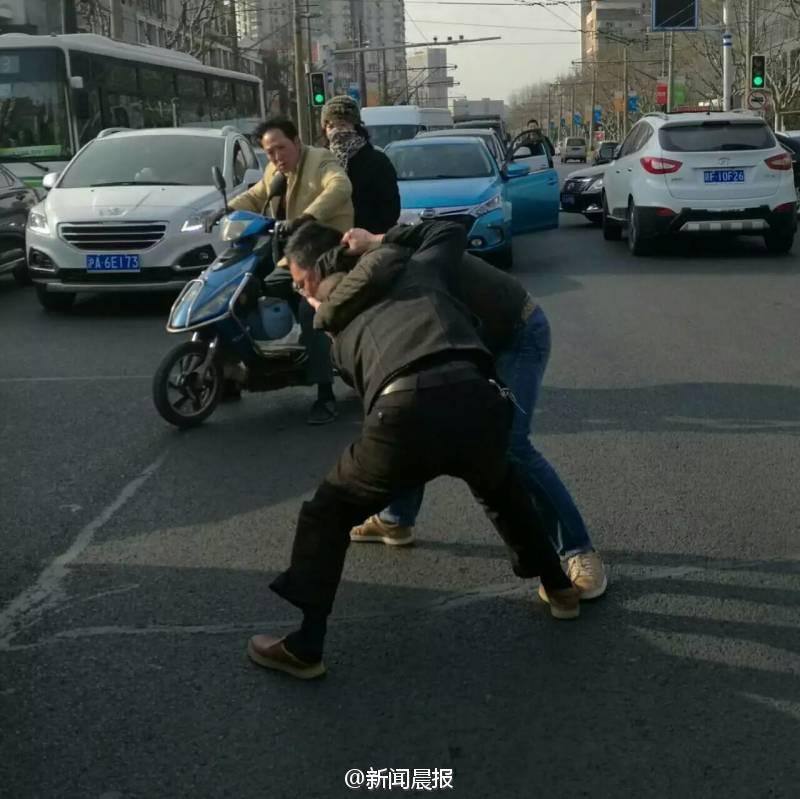 晨報訊 你一個過肩摔,我一個橫掃腿,接著扭打在一起,互相纏斗難分伯仲……這幕刺激的武打動作場景,昨天早高峰時在上海安波路營口路上演,而沖突竟源于“路怒”!目擊者肖先生告訴記者,昨天上午8點不到,他經(jīng)過安波路、營口路路口時,看看兩名男子扭打在一起,場面十分激烈。“我順勢拿出手機(jī)拍了幾張照片,旁邊也有行人上去勸架?!毙は壬f,在兩名男子的身旁,一橫一豎停著兩輛轎車,“我想可能是兩個人開車有點摩擦引起的‘路怒’吧?!?/font>
