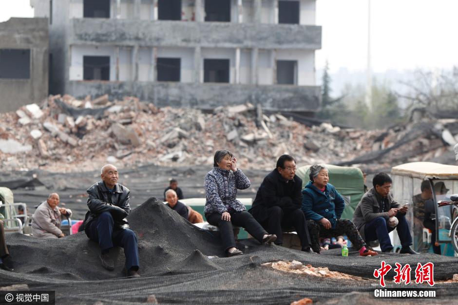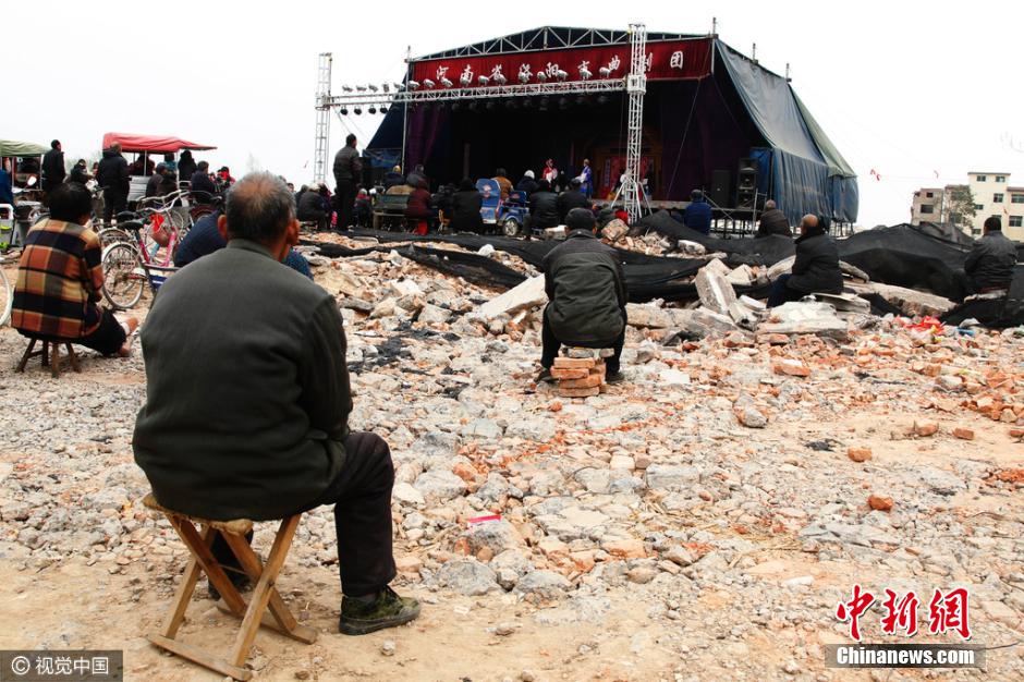 2016年3月23日,河南省鄭州市石佛村,拆遷后的都市村莊中,除了僅存的幾幢殘破的老樓外,其它民宅基本被夷為平地。在一個(gè)籃球場(chǎng)大小的鋼結(jié)構(gòu)戲臺(tái)出現(xiàn)在瓦礫廢墟之上,一出出豫劇正連軸上演。戲臺(tái)上,豫劇演員拉足了唱腔,傾力獻(xiàn)唱;戲臺(tái)下,數(shù)百名老人,扎堆擠做在大片碎磚之上沉醉于精彩唱段和劇情之中。放眼已成廢墟村莊,移動(dòng)式的露天戲臺(tái)在殘磚碎之中,頗顯歷史滄桑。圖片來源:視覺中國