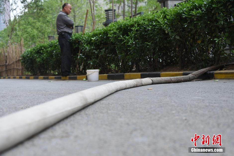 4月5日上午9時(shí)許,未來(lái)路街道巡防隊(duì)員司廣紅、盧龍等三人巡邏中發(fā)現(xiàn)一件奇葩事:有一根消防管從燕莊新區(qū)南院9號(hào)樓北面的20樓一家住戶窗口被放下,水管的另一頭直通小區(qū)柵欄里的小菜園。鄭州市燕莊村一村民住上了高樓,卻仍然放不下種地種菜。把小區(qū)垃圾清理出來(lái),開(kāi)墾出一片小菜園,又從20層的高樓往下放水澆菜。這種菜的成本遠(yuǎn)高于買菜,但他卻樂(lè)在其中。李四信 攝 圖片來(lái)源:視覺(jué)中國(guó)