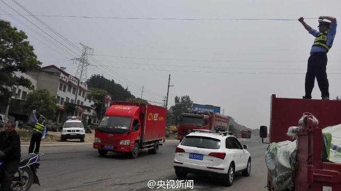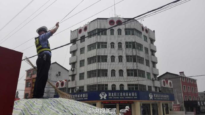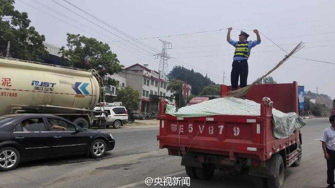 交警董金橋手托線(xiàn)纜。 央視記者 魏軼 圖片來(lái)源:央視新聞官方微博
