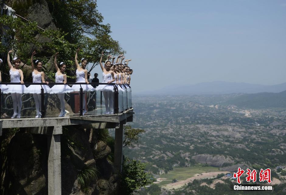 5月16日,眾多身著芭蕾舞服的舞蹈愛(ài)好者來(lái)到湖南平江石牛寨,在音樂(lè)玻璃棧道和懸崖邊跳起了芭蕾,高難度的舞姿吸引了眾多游客圍觀。 楊華峰 攝