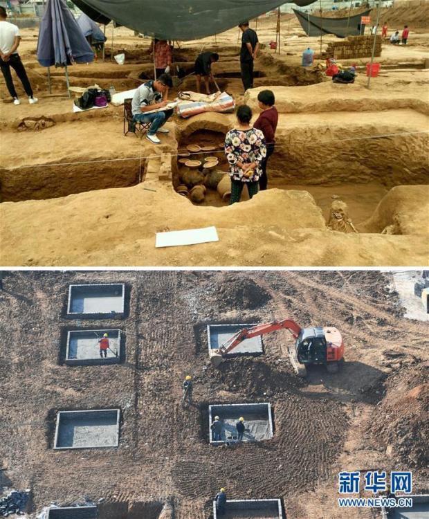 拼版照片:上圖為受訪者提供的河南汝州望嵩文化廣場漢墓群文物發(fā)掘現(xiàn)場照片(資料照片);下圖為12月8日拍攝的河南汝州望嵩文化廣場工地施工場面。 新華社記者 馮大鵬 攝 圖片來源:新華網(wǎng)