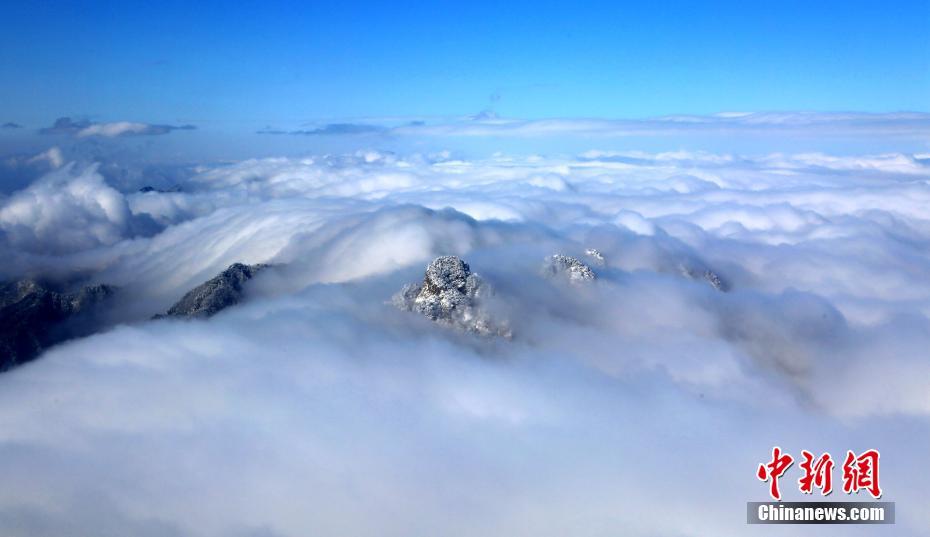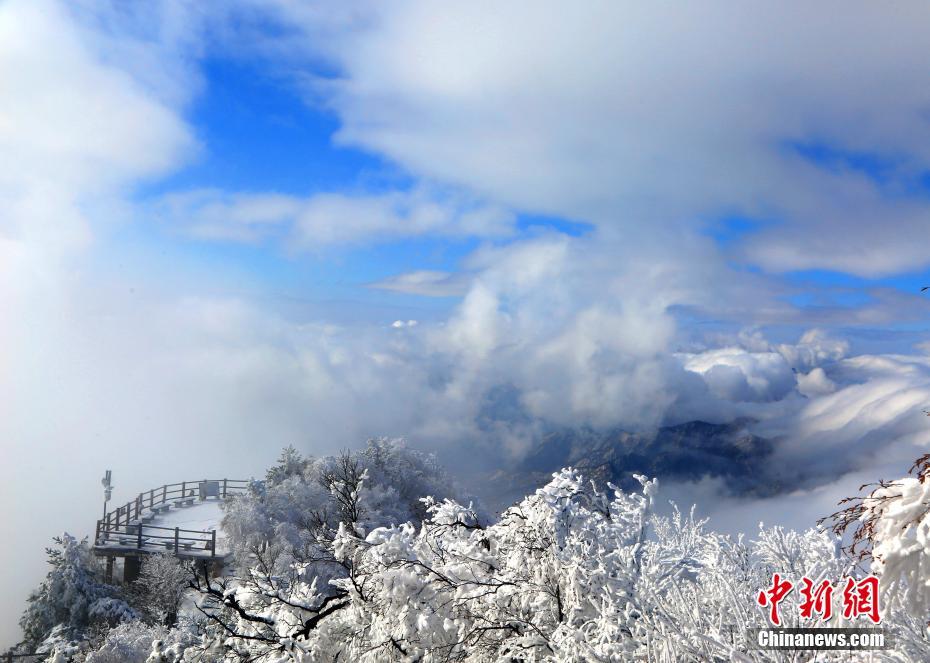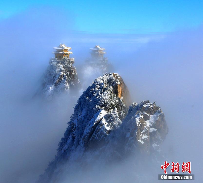 1月7日,連續(xù)降雪之后,位于河南洛陽(yáng)的道教圣地老君山雪后初晴,海拔2000米的伏牛山主峰上,白雪皚皚、銀裝素裹,加之云海浮現(xiàn)與藍(lán)天白云交相輝映,絕壁道觀似瓊樓玉宇幻如仙境美不勝收。圖為云海流過(guò)山間。王中舉 攝