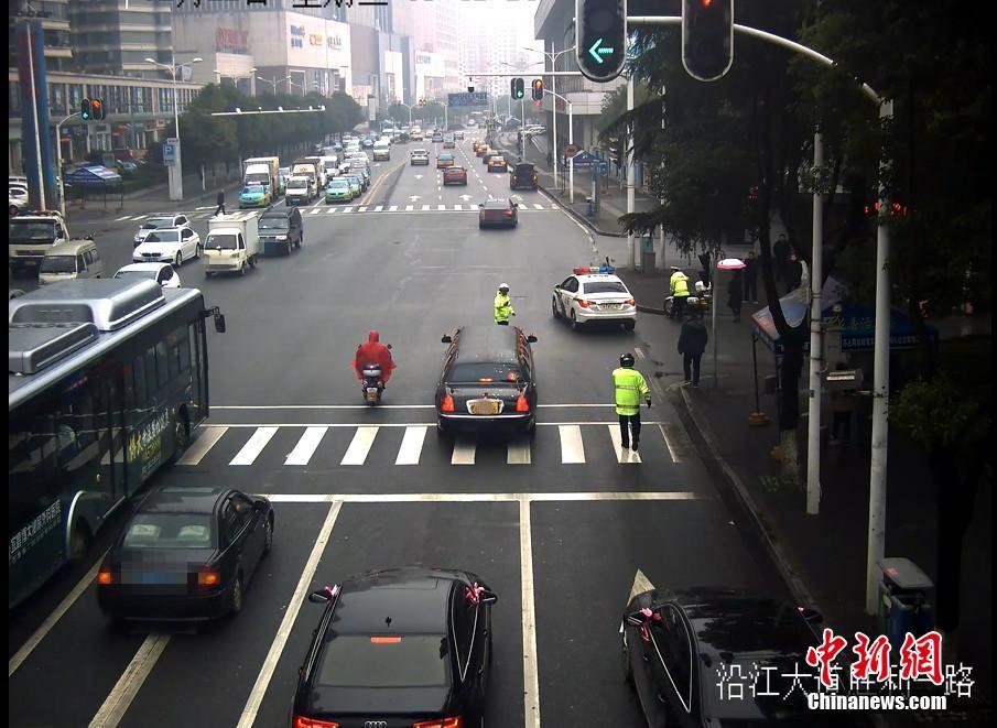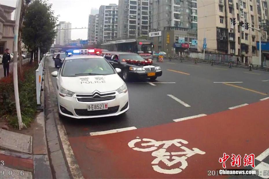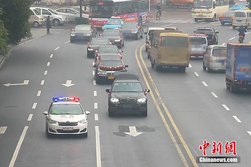 2月22日,湖北宜昌一位新郎在迎親時(shí),迎親車隊(duì)的頭車因涉嫌套牌被交警查獲。在新郎家屬和交警溝通后,當(dāng)?shù)亟痪诵曰瘓?zhí)法,先“開道護(hù)送”,迎親結(jié)束后才扣下套牌車。圖為警車“護(hù)送”新人完成儀式。石寧 攝