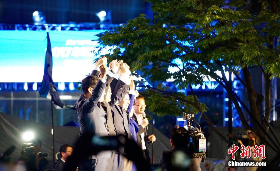 當(dāng)?shù)貢r(shí)間5月9日深夜,韓國(guó)第19屆總統(tǒng)選舉共同民主黨候選人文在寅及其競(jìng)選團(tuán)隊(duì)現(xiàn)身首爾光化門廣場(chǎng),發(fā)表“勝選演說(shuō)”,與支持民眾握手慶祝。據(jù)出口民調(diào)顯示,文在寅在當(dāng)日進(jìn)行的大選投票中以41.4%的支持率絕對(duì)優(yōu)勢(shì)勝選。在選舉管理委員會(huì)公布的大部分開票結(jié)果中,文在寅得票率也遙遙領(lǐng)先,提前鎖定勝局。 中新社記者 吳旭 攝