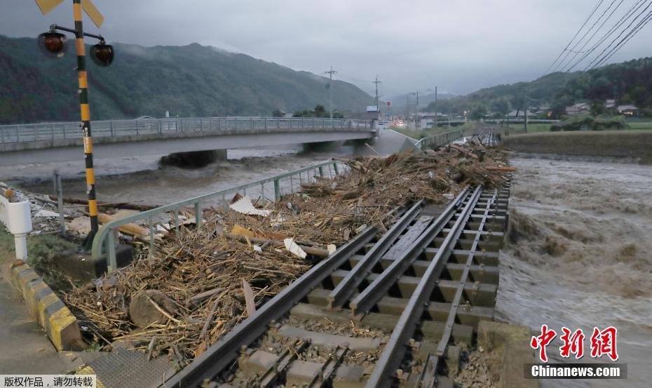 臺風“南瑪都”4日吹襲日本,挾著時速144公里強風,在九州島東南部的長崎登陸,隨后九州島交通陷于癱瘓。圖為九州島福岡縣,洪水過后,鐵道上堆滿了木屑和垃圾。