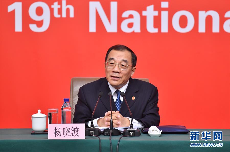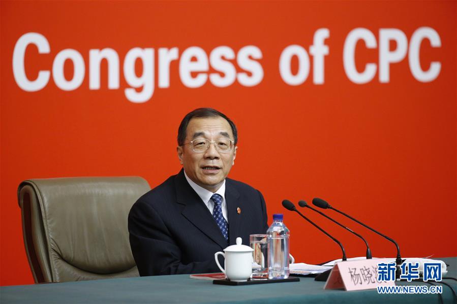 10月19日,中國(guó)共產(chǎn)黨第十九次全國(guó)代表大會(huì)新聞中心舉行記者招待會(huì),請(qǐng)中共中央紀(jì)律檢查委員會(huì)副書記、監(jiān)察部部長(zhǎng)、國(guó)家預(yù)防腐敗局局長(zhǎng)楊曉渡,中共中央組織部副部長(zhǎng)齊玉介紹加強(qiáng)黨建工作和全面從嚴(yán)治黨情況,并回答記者提問。這是楊曉渡在介紹情況。新華社記者 沈伯韓 攝