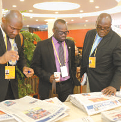 外國記者在十九大新聞中心翻閱報紙,了解十九大新聞。 人民視覺